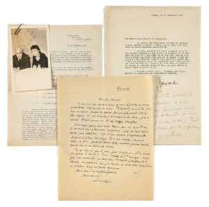 – 1 lettre dactylographiée signée et annotée d’Albert Cohen à Marcel Pagnol, 2 p., du 14 novembre 1956, accompagnée d’une photographie d’Albert Cohen. Les futurs écrivains se rencontrent et se lient d’amitié durant leur scolarité au Lycée Thiers, à Marseille. Albert Cohen lui donne des nouvelles et déclare, songeur : « Mon cher Marcel, je rêve qu’un jour je te rejoindrai à ton moulin ou à la Gaude et que, pendant quelques mois, nous écrirons ensemble, nous montrant nos pages l’un à l’autre et parlant fort. »