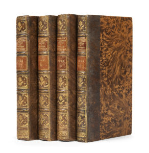 Petite mouillure claire en tête des ff. aux tomes I-III, atteignant parfois les planches, 2 ff. détachés en tête du t. III, petites rousseurs et piqûres, petits travaux de ver en marge intérieure des 100 premiers ff. du t. IV, les 2 ff. de table à la fin du t. I sont plus courts en pied.