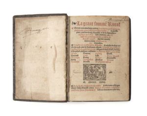 BOUTILLIER (Jean) — La Grant somme rural [sic]. — Paris, Denis Janot, 1538. — 2 parties en 1 volume in-4 (20,3 x 14,8 cm), veau brun, plats portant des roulettes et filets estampés à froid, dos à nerfs (reliure de l’époque).