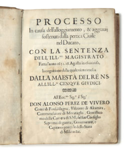 Rare recueil de pièces sur la répartition des charges de logement des troupes espagnoles sur les biens possédés par les « cittadini » de Milan. Cette forme d’imposition très impopulaire était en question depuis l’époque de Charles Quint, la Cité de Milan prétendant à l’exemption de logement sur les biens possédés par ses membres.