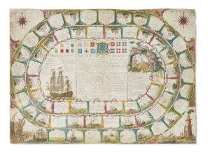 Jeu de l’oie, dédié au Duc de Penthièvre, Amiral de France et gouverneur de Bretagne, comportant 63 cases sur un sujet de marine, de l’embarquement jusqu’à l’arrivée à bon port. Au centre sont imprimées les règles du jeu. Sont également fournis des rudiments sur les blasons des pavillons des différentes nations. Cette « récréation » est l’œuvre de Jean-Baptiste Crépy, graveur, éditeur et marchand d’estampes.