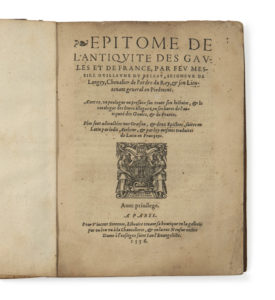 DU BELLAY (Guillaume) — Epitome de l’Antiquité des Gaules et de France […]. — Paris, Vincent Sertenas, 1556. In-4 (21,5 x 15,8 cm), vélin, dos muet (reliure de l’époque).