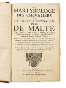 GOUSSANCOURT (Mathieu de) — Le Martyrologe des chevaliers de S. Iean de Hierusalem, dits de Malte. Contenanty leurs éloges, armes, blasons […]. — Paris, Simeon Piget, 1663. — 2 tomes en un fort vol. in-4 (34,5 x 21,9 cm), veau granité brun,...