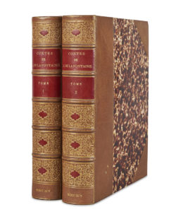 Vie de la Fontaine en déficit au t. I (VII p.), des frottements au premier plat du t. II, charnières un peu frottées sur les 2 tomes, quelques taches d’encres à certains ff., fortes piqûres affectant la suite gravée par Delpech, quelques rousseurs éparses, des gardes brunies.