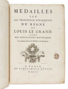 Important ouvrage de numismatique à la gloire de Louis XIV dont la réalisation, lancée par Colbert, demanda une quarantaine d’années de travail. Le texte latin des médailles et les notices historiques françaises les accompagnant sont dus à la collaboration de différents membres de l’Académie des Inscriptions et Belles-Lettres dont Racine, Boileau, Tallemant, Praud, Henriquez.