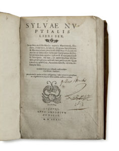 NEVIZZANO (Giovanni) — Sylvae nuptialis libri sex. — Lyon, Jean Marcorelle pour Antoine de Harsy, 1572. — In-8 (16,8 x 10,2 cm), vélin à recouvrements, dos lisse avec titre à l’encre (reliure de l’époque).