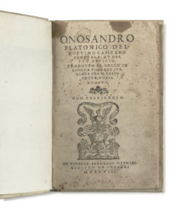 ONOSANDER — Dell’ottimo capitano generale, et del suo ufficio […]. — Venise, Gabriel Giolitto, 1548. — Petit in-8 (15,4 x 9,9 cm), vélin ivoire, cadre et fleurons à froid sur les plats, dos lisse avec pièce de titre caramel, papier...