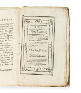 [RÉTIF DE LA BRETONNE (Nicolas-Edme)] — Les Posthumes. — Paris, à la maison, 1802. — 4 vol. in-12 (18,5 x 11 cm), brochés, couvertures d’attente de papier marbré bleu, les deux derniers volumes partiellement coupés.