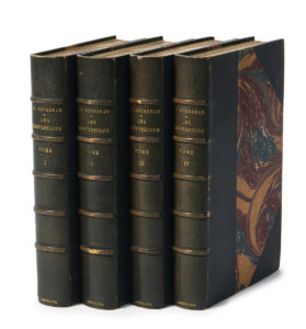 ROUSSEAU (Jean-Jacques) — Les Confessions de J. J. Rousseau, suivies des Rêveries du promeneur solitaire. — Genève, [s. n.], 1782-1789. — 4 vol. in-8 (21,2 x 13,4 cm), demi-maroquin gris-bleu à coins, dos à nerfs, tête dorée (Pagnant).