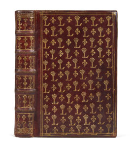 rouge, semé de fleur de lis dorées alternant avec des chiffres L couronnés, dos à nerfs avec rappel du motif, tranches dorées (reliure de l’époque).
