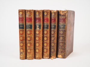 intitulé Matière médicale de M. Geoffroy. Paris, Didot le jeune 1767. 6 vol. in-8. Veau brun, fil. d'encadr. dos lisse orné. Usures aux coiffes et aux coins ; travail de vers en marge du volume de texte. Un volume de texte donnant l'explication des planches qui manque souvent. _x000D_ 5 volumes de planches contenant 729 planches toutes gravées par Garsault. Collection complète, rare (Brunet II, 1496).