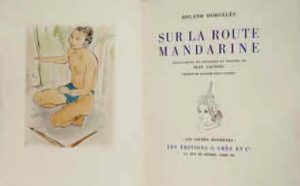 [Launois] Dorgeles Roland. Sur la Route Mandarine. Paris, Crès, 1929, petit in-4 carré relié dans un plein maroquin corail, signé de Maurice Nicolas et Nicolet, tête dorée, couverture illustrée conservée, contre-plats décorés de quatre lets et