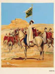 Paris, Guilhot, 1945, in-folio relié demi-velin à la bradel, dos lisse à décor peint d’un méhariste, pièce de titre, cou- verture conservée, tête dorée, 76 pages illustrées par Edmond Lajoux, d’un frontispice et à chaque page de dessins en couleurs, suivies de 20 planches hors- texte également en couleurs. Quelques rares rousseurs. Edition originale tirée à 991 exemplaires numérotés, celui-ci sur Vélin pur l de Rives