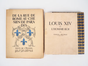 MAURRAS (Charles). Louis XIV ou l'Homme-Roi. Orné de bois dessinés et gravés par Jean Vital Prost. Paris, Editions du Cadran s.d in-4, en ff. Etui décoré. Edition originale. 1/450 sur Auvergne. Joint :_x000D_ - KESSEL (J.). De la rue de Rome au...