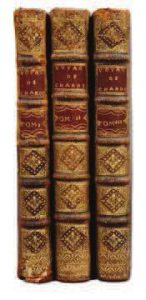 chez De Lorme, 1711, 3 volumes in-4 reliés plein veau granité de l’époque, dos à nerfs ornés de eurons dorés, double pièce de titre, roulette sur les champs, tranches rouges, reliure légèrement épidermée, petit travail de vers au dos du tome 1 et au premier plat du tome 2, quelques coins émoussés. 4 nc (titre, préface, avis au relieur) + 279 pages, 454 pages et 254 pages suivies de la table (13 nc), texte à deux colonnes, traces d’humidité au tome 1, petites et centrales aux tome 2 et 3, quelques trous de vers marginaux, 4 feuillets gilotés de la page 185 à 192 et une planche dépliante a été découpée sans manque, au tome 3. Illustrés de 3 vignettes de titre répétées, de 3 bandeaux, d’une carte dépliante, d’un plan dépliant, de 19 planches hors-texte, de 53 planches ou vues cavalières, doubles ou dépliantes, et 5 planches de calligraphie dont 3 doubles.