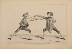 souscripteurs), 47 pl., [1] f. (table), demi-vélin du XIXe s., dos lisse, pièce de titre noire (dos taché, qq. rouss. et saliss. généralement limitées aux marges). Édition originale de ce grand classique de l'escrime, dédiée à la famille royale d'Angleterre, dont l'auteur était le maître d'armes attitré. C'est un recueil de 47 planches gravées sur cuivre, légendées. Composé en français, l'ouvrage fut publié à Londres, où son auteur avait fondé la célèbre Angelo's School of Arms, à Carlisle House fameuse salle d'armes qui accueillit notamment Casanova et le Chevalier d'Éon.