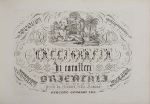 [Calligraphie.] SELLA (Antonio). Calligrafia di Antonio Sella Romano che comprendre le norme principali per eseguire con facilità qualunque specie di carattere incisa da Giacomo Bonanni. Roma, Bonanni, 1840. In-folio oblong [360 x 520 mm], 53...