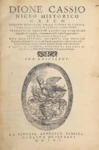 [Livre du XVIe siècle]. DION CASSIUS. De fatti de Romani dalla guerra di Candia, fino alla morte di Claudio imperatore. In Vinegia, appresso G. Giolito de Ferrari, 1565. Fort in-4, [42] f., 843 p., velin ivoire lég. post., dos lisse, pièce de...