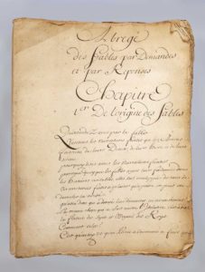 [Manuscrit.] ABRÉGÉ DES FABLES par demandes et par réponses. Fin du XVIIIe siècle. In-4, en feuilles, à toutes marges, 34 cahiers manuscrits, numérotés 1 à 38. (il manque les cahiers, 5, 6, 7 et 35 ; mouillure claire aux cahiers 26 et 27 ;...