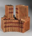 et des sous-titre rouge, tomaison sur un médaillon vert, double encadrement de filets et roulettes dorées aux plats, roulette dorée aux coupe et chasses, tranches dorées (nombreux défauts aux reliures, dont des et coins coiffes usés ; brunissures). Importante édition des oeuvres de Rousseau, établie par Pierre Moultou et Du Peyrou, dans laquelle la première partie des Confessions a paru pour la première fois, en même temps qu'une version séparée en deux volumes. Les tomes 16 et 17 de cette édition renferment la suite et la fin des Confessions. Exemplaire enrichi des planches issues de l'édition de Bruxelles, 1774-1783 *: portrait de l'auteur gravé par A. de Saint Aubin d'après La Tour, 37 planches gravées, principalement d'après Moreau le jeune, 19 planches de musique dont 14 dépliantes. La facture et le décor de la reliure pourraient la rattacher à l'atelier de Derôme. Provenance : collège de jésuites de Dijon (cachet moderne aux titres). (Tchemerzine V, 568).