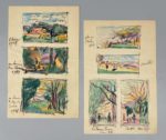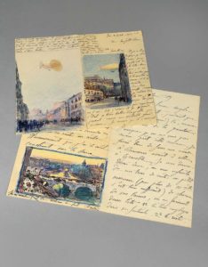- 12 L.A.S. de Jules Flandrin, certaines accompagnées d'un ou plusieurs dessins. 12 pages in-12 et 10 pages in-8, soit : 3 L.A.S. adressées à [Joseph Flandrin] 1903, 1909, 1926, l'une de Palerme, avec un dessin, encre et crayons de couleurs, une autre comportant un dessin à l'encre d'un jeune enfant, signée des initiales ; 2 L.A.S. adressées à « Mon cher Roro » et « Mon cher petit Roro », de Paris, 1902 et 1907, comprenant 3 dessins aux crayons de couleurs et gouache dont un signé et daté ; 1 L.A.S. adressée à sa « Chère soeur », Paris, 1902 ; 2 L.A.S. adressées à « Ma bonne Angèle », Paris, 1905 et 1919 ; 1 L.A.S. adressée à « Ma chère petite Eliane », Paris, 1902, illustrée d'un dessin à l'aquarelle ; 1 L.A.S. incomplète, illustrée de 2 vues de Rome, à l'encre et crayons de couleurs, dont une signée et daté 1931 ; 1 L.A.S. adressée à « Bien cher ami commandeur », Corenc, 1927, 8 pages in-4, comprenant 4 photographies et 1 dessin à l'encre et crayons de couleurs ; joints 3 feuillets in-8 offrant les portraits de 7 membres de la famille, à l'encre, crayon, crayons de couleurs, signés. 1 L.A.S. adressée à son frère François et sa « Chère Lily », 1933 ; - 22 dessins ou esquisses signés de Jules Flandrin (y compris de ses initiales, quelques-uns datés), portraits et paysages, formats variés entre in-12 et in-4, techniques diverses dont 4 portraits en pied de femmes élégantes, crayon et aquarelle, datés 1920. - 2 L.A.S. de François Flandrin, adressées à sa mère, Nice, 1926 et 1929, dont 1 illustrée de 4 dessins à l'aquarelle, signés et datés ; 1 dessin signé, daté de 1922. - 27 dessins et esquisses, de formats divers, non signés mais de Jules ou François Flandrin, 1 carnet, 6 photographies de membres de la famille ; il se trouve au verso d'une esquisse, une liste manuscrite de 20 tableaux de Jules Flandrin accompagnés de leurs prix. Provenance : Fonds d'archives du Docteur Joseph Flandrin, par descendance. Docteur Joseph Flandrin (1867-1942), médecin accoucheur en chef de l'hôpital de Grenoble, et frère du peintre Jules Flandrin, est un collectionneur et bibliophile forcené. Il est un grand promoteur de l'art français de son temps.