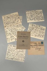 correspondance où il est souvent question d'un dessin de Louise Hervieu, La maman Caubet de Sentein (Ariège), que l'artiste a envoyé à son correspondant en 1921, après mûre réflexion, « un choix qui me tenait au coeur car je crois fermement qu'il y a entre une oeuvre et son sujet, plus de rapports secrets qu'on ne le croit généralement ». En 1922, elle le remercie d'avoir accepté de lui avoir prêté ce même dessin à l'occasion d'une exposition. Le 30 octobre 1922, elle évoque sa « prochaine et dernière exposition (chez Bernheim-jeune). Après quoi, je dois vivre et travailler (si je le peux encore !) à l'écart de toute manifestation car je ne suis plus qu'une fille malade ». Le peintre évoque aussi des livres illustrés, Le Spleen de Paris de Baudelaire, et une suite de nus en souscription à la Librairie de France. Le 12 août 1925, elle adresse au Dr. Flandrin une lettre bouleversante où elle s'associe à sa douleur après la perte de sa fille. Il est joint le catalogue de l'exposition de dessins de Louise Hervieu présentée à la galerie Bernheim-jeune en novembre 1922 (In-12, 8 pages, broché), et une notice sur le peintre, extraite d'une revue. Jointe également, une lettre autographe signée, adressée à monsieur Rome, datée de Boulogne, 24 avril 1921. 2 pages in-12 oblong. Il y est question d'oeuvres de Flandrin, de Vallotton et de Marvel. Provenance : Fonds d'archives du Docteur Joseph Flandrin, par descendance. Docteur Joseph Flandrin (1867-1942), médecin accoucheur en chef de l'hôpital de Grenoble, et frère du peintre Jules Flandrin, est un collectionneur et bibliophile forcené. Il est un grand promoteur de l'art français de son temps.