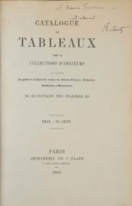 BURTY (Philippe). Catalogue de tableaux tirés de collections d'amateurs et exposés au profit de la Caisse de secours des Artistes peintres, sculpteurs, architectes et dessinateurs 26, Boulevard des Italiens. Paris, Imprimerie de J. Claye, 1860....