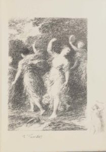 enchâssée dans le premier plat datée 1904 et signée D. Puech (monument à André Chénier), non rogné, couverture et dos, étui [Charles Meunier]. 12 lithographies originales hors texte de Fantin-Latour. En-têtes et culs-de-lampe lithographiés par G. Simoes da Fonseca. Tirage limité à 177 exemplaires numérotés : un des 150 (n° 137) avec double suite en sanguine sur papier de Chine avec remarques et en noir sur japon avec remarques des lithographies ainsi que des ornements. Ces exemplaires sont revêtus de la reliure conçue et exécutée par Charles Meunier ornée de la plaquette de bronze de Denys Puech. Avec : Lettre autographe signée de Fantin-Latour datée du 5 février 1881 à son confrère Boivin.
