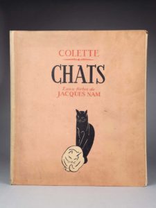 NAM. COLETTE. Chats. Paris, chez l'artiste Jacques Nam, [1935]. In-folio, en feuilles, chemise éditeur demi-toile sable, plat sup. illustré (chemise empoussiérée, petites rouss.). Compositions originales du peintre et graveur Jacques Nam...