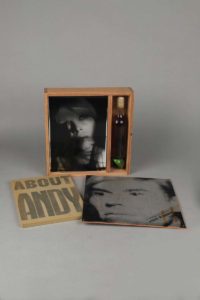 FINKELSTEIN (Nat). A catalogue as multiple Andy Warhol. 1992. About Andy. Amsterdam, Antiquariaan Parade, 1992. Boîte livre-objet en bois (32 x 32 x 7 cm), avers et envers ornés d'une sérigraphie argentée ou rouge d'un portrait de Warhol par Nat...