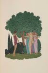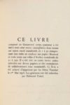 dessin géométrique entrelacée d'un filet noir, le tout parsemé de points bleus et blancs, auteur et titre en lettres dorées, gardes de moire rose clair et foncé, couverture et dos, chemise et étui assortis. 30 illustrations et nombreuses lettrines en couleurs d'André Marty. Un des dix exemplaires de collaborateurs, celui-ci sur Japon nacré destiné à Monsieur et Madame Creuzevault, avec une suite en couleurs sur papier Montval en fin de volume. Avec : Aquarelle originale signée d'André Marty, reprenant l'illustration reproduite page 65. Belle reliure non signée mais très certainement de Creuzevault.