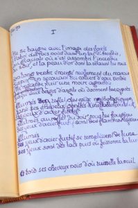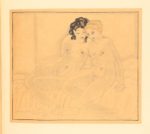 repoussé d'une gazelle atteinte par une flèche de Ary Bitter, doublures de soie moirée beige, doubles gardes, couv. conservées, chemise demi-maroquin violet à bande rempliée, étui [G. Cretté, succ[esseur] de Marius Michel] (manque la tête à l'étui). Frontispice, titre et 3 illustrations de Sylvain Sauvage, gravées sur bois par Pierre Bouchet. Texte dans un encadrement et largement orné de frises et lettrines en rose et noir. Tirage limité à 287 exemplaires : celui-ci sur japon nominatif pour Sylvain Sauvage. Exemplaire enrichi de : Poème manuscrit signé de Pierre Lous (in-4, encre bleue sur papier bleu) ; 5 dessins originaux signés à la mine de plomb, rehaussés à l'encre et à l'aquarelle, tous faisant partie de l'illustration définitive ; décomposition des couleurs d'une illustration ; suite des bois sur chine en 2 états.