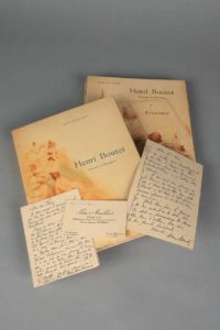 illustrée et dont le second volume renferme le Catalogue raisonné de l'oeuvre. L'un des exemplaires de tête sur japon (n° 8/35 pour le t.1, et 6/60 pour le t.2) comprenant les gravures en deux états. Avec un prospectus au t.1, et une planche sans doute ajoutée au début du t.2. Sur la serpente du frontispice montrant l'atelier de Boutet, les personnages représentés ont été identifiés au crayon. Exemplaire enrichi d'une carte de visite de l'auteur et de 2 L.A.S. de Henri Boutet, l'une adressée à l'éditeur Floury (1 page ½ in-12) concernant des épreuves pour le livre, celles de la Femme au corset, du Ruban noir, de l'Ondée et de la Femme à la puce ; l'autre, adressée à « Mon cher ami » (1 page in-8°), où il est également question d'une épreuve de la Femme au corset. Provenance : Mention ms. au crayon au v° d'une L.A.S. : « Offert par Floury le 6/8/95 ; joint au Catalogue Boutet » ; Petit cachet de collection monogrammé sur une page de titre.