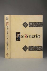 GRADASSI. NOSTRADAMUS. Les merveilleuses centuries & prophéties de Nostradamus. Nice-Paris, Éd. Artisanales Sefer, 1961. In-folio, parchemin à la bradel, titre en long en rouge, noir et doré, deux illustrations sablier et tête de mort peintes,...