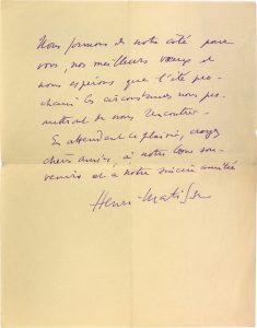 MATISSE Henri. Lettre autographe signée Henri Matisse à de “ chers amis ” qui semblent habiter Fontenay près de Paris. Nice, 1 place Charles Félix, 15 janvier 1958 ; 2 У pages in-4 sur papier vergé au filigrane armorié.