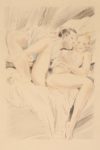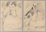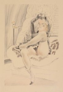 érotique composé d'un frontispice et de 30 lithographies originales libres de Rojan, coloriées au crayon de couleurs. Chaque planche est montée sous passe-partout. Tirage limité à 516 exemplaires numérotés et justifiés par l'éditeur, tirés sur presse à bras sur papier vergé teinté d'Arches : un des 500 réservés aux bibliophiles souscripteurs (n° 85). Avec : 2 dessins originaux de Rojan, aux crayons de couleurs.