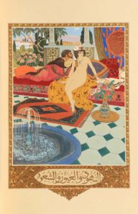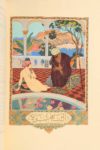 angles arrondis, fers angulaires de style oriental, double filet doré aux coupes, doublures de maroquin havane orné de trois listels de maroquin bleu en encadrement, bordés de filets dorés, motifs d'entrelacs et de feuilles stylisés dorés entre les deux cadres intérieurs, doublures de soie moirée bleue, doubles gardes, tranches dorées sur témoin, couv. et dos conservés, étui [G. Mercier S[uccesseu]r de son père, 1921]. 20 planches de Léon Carré, coloriées et dorées au pochoir sous serpente légendée ; frontispice, vignette de titre, et nombreux encadrements, arabesques et lettrines imprimées en couleurs et à l'or. Tirage limité à 500 exemplaires : un des 100 sur Japon impérial (tirage de tête) (n° 39), contenant une suite en noir des hors-textes.