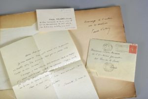 Descaves (1 p. in-4°, enveloppe (traces de pli en 4), datée du 8 mars [19]30). Il évoque son « petit recueil n° 2 de pensums (?) [] assez bien accueilli », se demande ce que Vautel [sans doute Clément Vautel, journaliste (1876-1954)] va penser de son Descaves, signale son étude sur Durtal dont les épreuves ont été volées à la NRF ; du même, une carte de visite avec mention autographe, datée a posteriori de 1923.