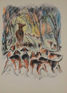 HOBI. VIALAR (Paul). La grande meute. S.l., André Vial, 1971. In-4, en feuilles, couv. rempliée, chemise et étui éditeur. 14 lithographies originales en couleurs de Horst Billstein, dit Hobi, dont une sur double page. Tirage limité à 115...