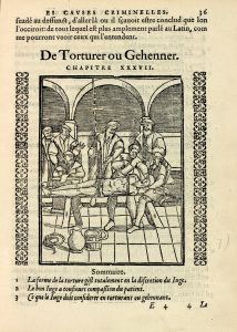 Ouvrage “ assez rare ” (M. Funck, Le livre belge à gravures) connu surtout par les éditions latines. Celle-ci, la dernière et la plus complète, augmentée des ordonnances, statutz & coustumes de France ” est ornée de 69 GRANDES FIGURES GRAVÉES SUR BOIS, LA PLUPART MONTRANT LES TORTURES INFLIGÉES AUX ACCUSÉS ET LES SUPPLICES AUX CONDAMNÉS. Bel exemplaire.