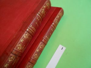 NATALIS, S.J. Approuvée par une bulle spéciale du souverain pontife CLEMENT VIII. Paris Pilon éditeur, 1853, 2 volumes grand in-folio (44 x 20 cm), 160-111pages, demi chagrin et percaline, rouges, plats décorés de croix à froid, dos à nerfs richement ornés. Les rousseurs des serpentes ont permis de garder fraîches les gravures. RELIURES signées « BUCHET relieur à ABBEVILLE ». Ex-libris d’ANVILLE.