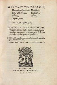 ÉDITION GRECQUE RARE ET IMPORTANTE tant par les manuscrits consultés que par les notes de H. Estienne. “ Elle mérite le nom de première édition, le texte de l'Agamemnon s'y trouvant pour la première fois complet ”. (Graesse, I, 20). TRÈS BEL EXEMPLAIRE, GRAND DE MARGES ET BIEN RELIÉ. Il provient des bibliothèques Edward Huth et des banquiers Hans Furstenberg, de Paris et Henri Bonnasse, de Marseille.