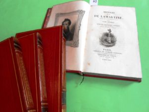 RELIURES ROMANTIQUES – ŒUVRES de M. DE LAMARTINE membre de l’Académie Française. Paris Charles Gosselin et Furne.1832, 4 volumes grand in-8, reliures plein veau rouge estampées, filets d’encadrement, dos à nerfs richement ornés. Ex-libris...