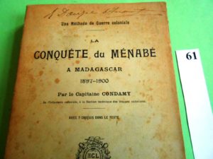 MADAGASCAR – LA CONQUETE du MENABE à MADAGASCR 1897-1900 par le Capitaine CONDAMY. Paris (circa 1900), in-8 broché, 342 pages avec 7 croquis et cartes. Ex-libris.