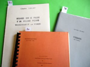 VISMES en VIMEU par Fernand Devismes (1980). SOCIABILITE dans le Vimeu au XVIII° siècle. P. BRIOIST. 1984 WOIGNARUE en VIMEU. Charles LECAT 1980. Les 3 publications :