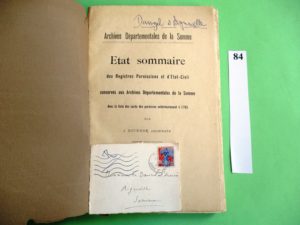 SOMME – ETAT SOMMAIRE des REGISTRES PAROISSIAUX et d’ETAT-CIVIL conservés aux Archives Départementales de la Somme avec liste des curés des paroisses antérieurement à 1793 par J. ESTIENNE Archiviste. Fontenay-le-Comte 1928, in-8, 280 pages +...