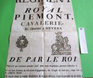 NEVERS - MILITARIA –– PLACARD (affiche XVIII°) du REGIMENT de ROYAL PIEMONT CAVALERIE en QUARTIER à NEVERS. « De par le ROY ceux qui voudront prendre parti dans ledit Régiment, peuvent s’adresser à……on leur donnera de très bons...