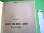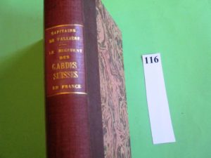 MILITARIA – LE REGIMENT des GARDES-SUISSES de France. Capitaine de VALLIERE. Lausanne/Paris 1912, in-8, 221 pages, planches et portraits. Feuillet tapuscrit ajouté avec les membres de la famille de SALIS. Ex-libris.
