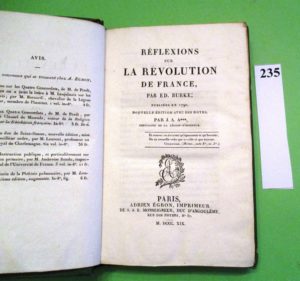 REVOLUTION FRANCAISE – REFLEXIONS par Ed. Burke publiées en 1790. Paris 1819, in-8, bradel, XXX-448 pages. Ex-libris A. LE MARESCHAL de Beauvais.