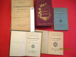 MILITARIA – LOT de 5 publications : LIVRE du Gradé d’INFANTERIE (1913) – MANŒUVRES d’INFANTERIE (2) – Historique du 42° d’ARTILLERIE (La Fère 1911) – Historique du 33° d’Infanterie. Ex-libris Danzel d’Aumont sur certains livres.